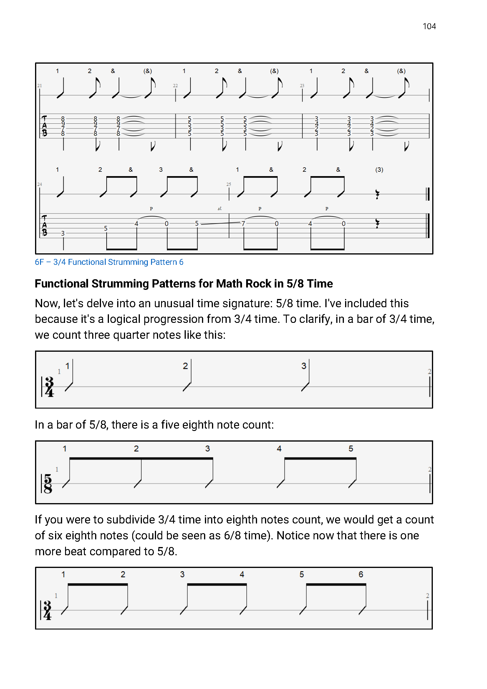 - Genre-defining strumming and picking patterns in multiple time signatures so you can finally break out of the same predictable rhythms and create grooves that sound interesting, mathy, and uniquely yours. (Pages 102–120)